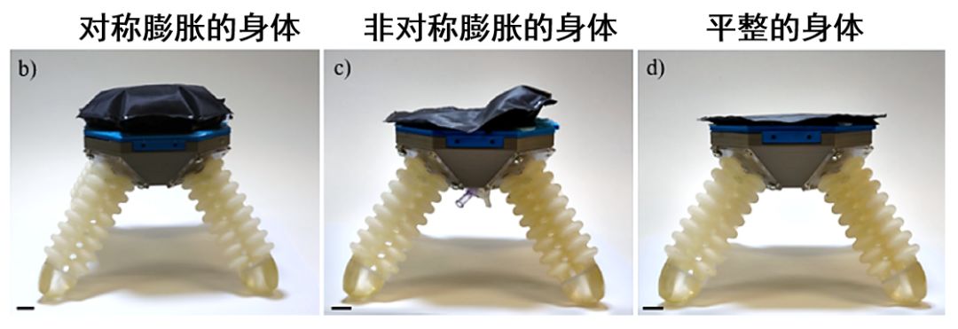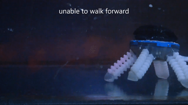 具体来说,当该水下机器人(水下重量为2.87N)需要在水流中保持静止,不对称膨胀的主体可以将水流作用域身体上的阻滞力降低40%(从0.52 N到0.31 N)当机器人要顺着水流行走时,充气的身体比平整的身体快16%。