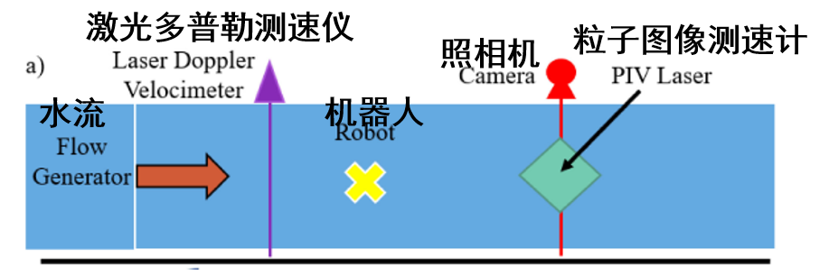 研究者设计了一个简易水槽,然后向机器人方向产生水流,并且用两个测速仪分别监测机器人前方/后方的水流速度,同时监测机器人自身的运动速度,以此来验证他们的设计有效性。
