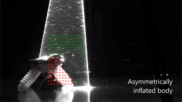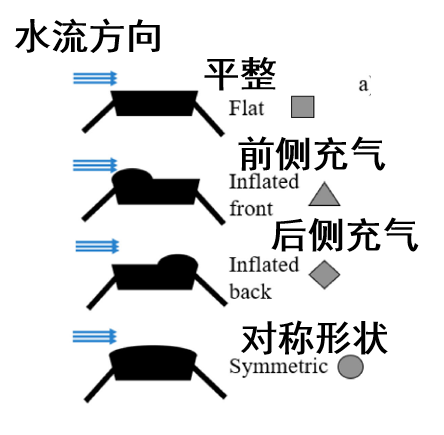 当我们对机器人的可变形身体的气袋进行充气/放气时,机器人的身体有三种状态,对称膨胀的身体,单侧膨胀的身体,以及平整的身体。根据流体力学的基本知识,在水中运动的物体受到的水流的拖拽力/阻力,与物体本身的形状直接相关,所以机器人正是通过调整身体的形状,来实现利用水流前进的目的。