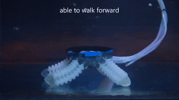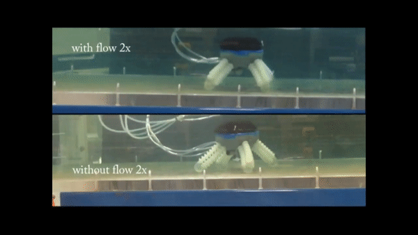 水生生物(章鱼,管族类生物)等借助流体特性(例如:浮力,升力,拖拽力)在水下快速移动,受到这点启发,来自于加利福尼亚大学(University of California)的研究者提出了一种新型的仿生软体水下行走机器人。该机器人可以通过监测水流方向,可以通过改变身体形状来借助水流的流体特性产生比较大的拖拽力,或者减小水流带来的阻力,从而极大的提升它在水底行走的运动性能,真正做到随波逐流。