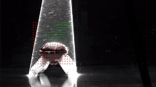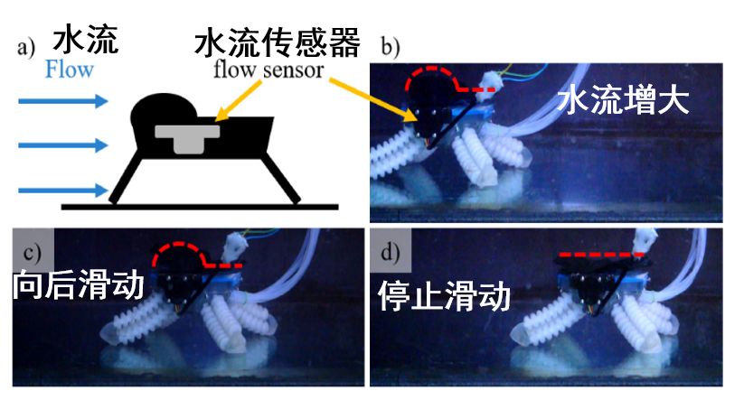 研究者们还在机器人身上添加了一个水流传感器,能够让其感知水流方向,从而改变身体形状来更好的适应当前的水流。如下图,机器人初始形状为沿着水流方向非对称膨胀,当机器人监测到水流速度超过某一个特定的阈值,机器人开始向后滑动。随后机器人便调整身体为平整状态,从而减小了水流的作用并且停止滑动。这个实验证明机器人可以有效的通过调整身体来适应不同的流速和流向的变化。