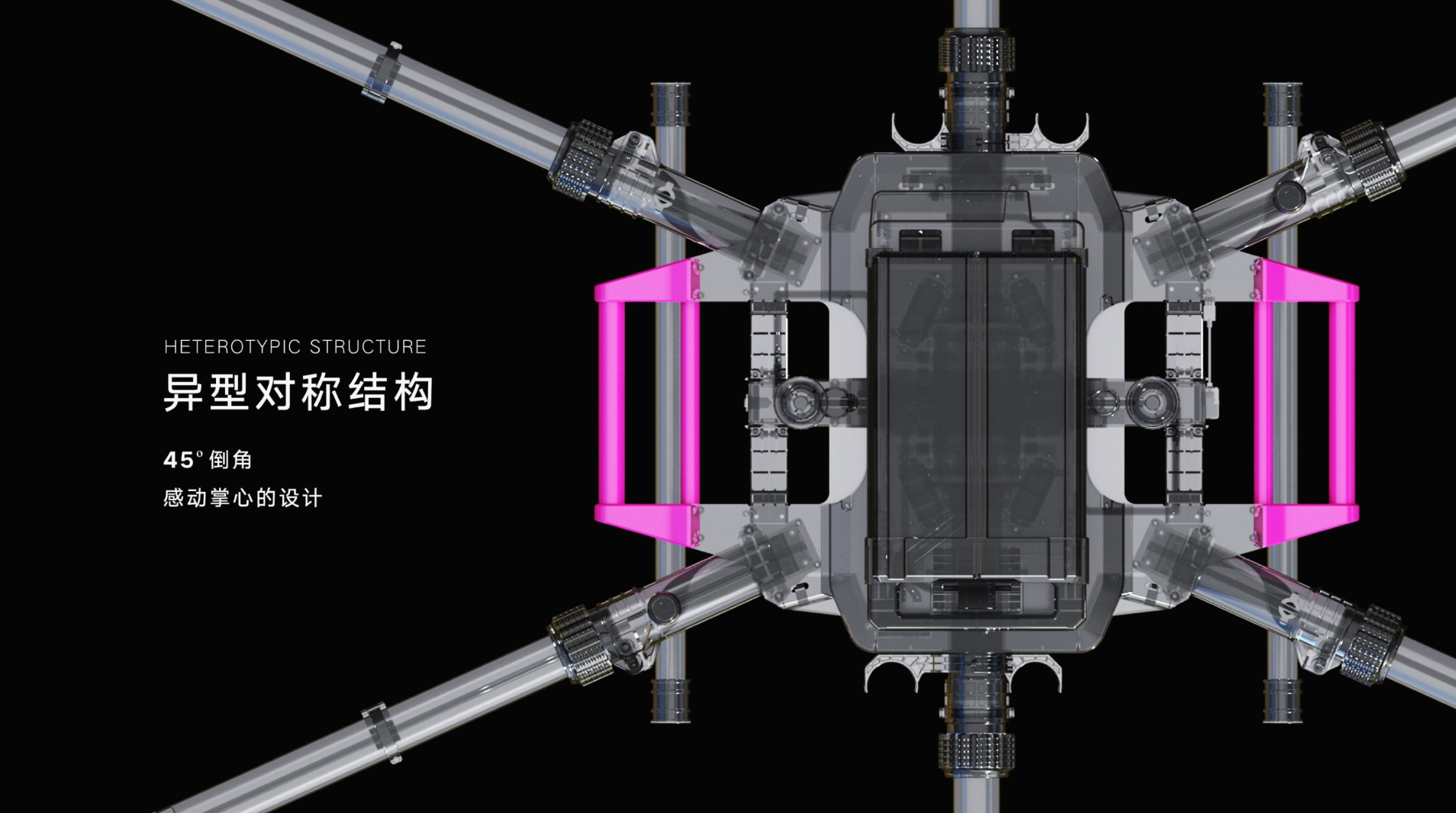 行业首创的斜向怀抱设计,其优点在于整机折叠系数为0.5,一个普通的皮卡车可以拉个2个F22无人机,斜向角度为45度,左右机臂的折叠就像男女朋友拥抱一样,恰到好处。
