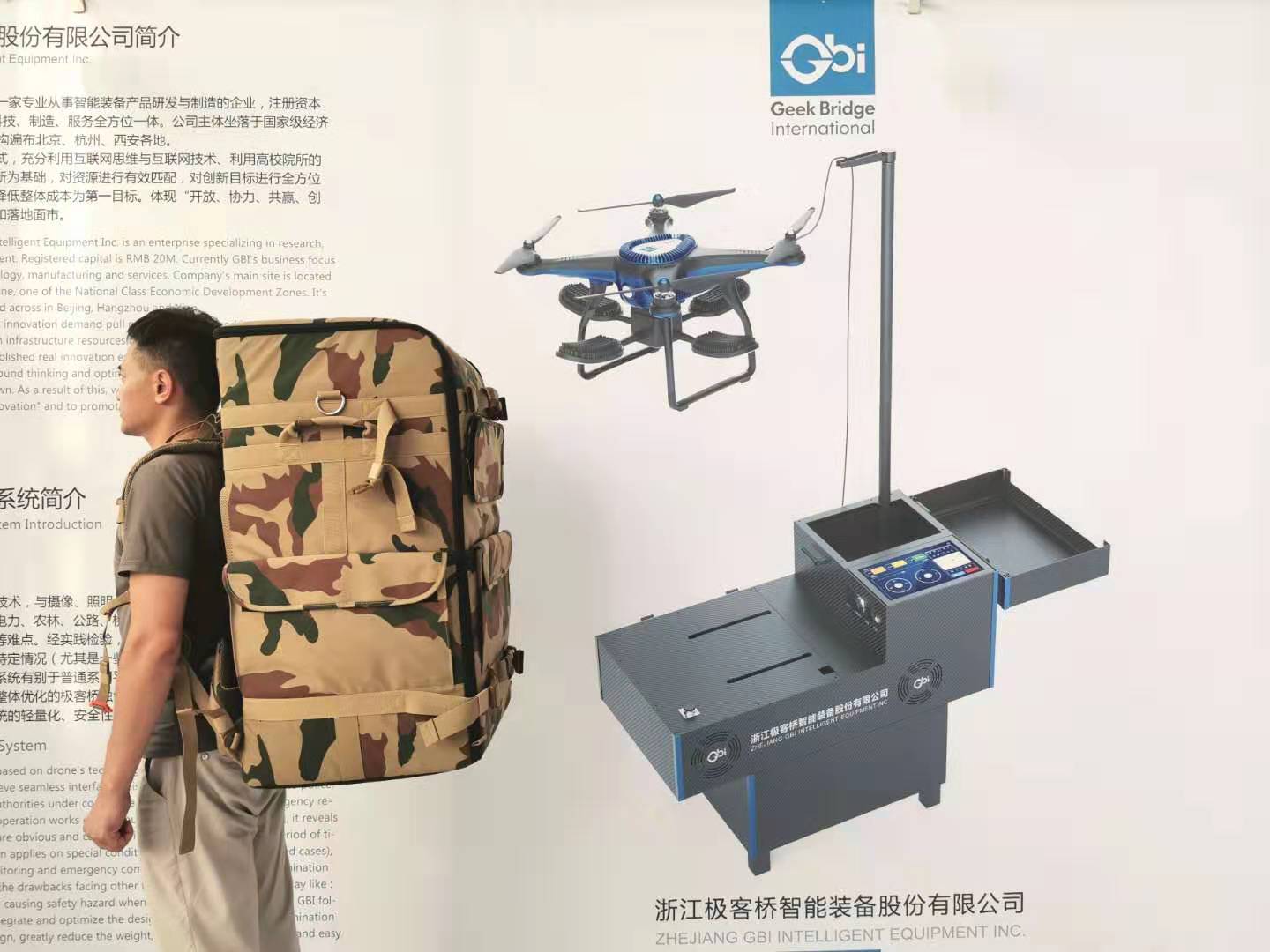 极客桥系留滞空救援系统由手持地面控制系统(遥控器)、小型飞行平台(含电池约1kg)、LED灯/喊话器/抛投器(约200g)、收/放线装置(约2.5kg)以及移动式电池供电系统(5-7kg)。整套系留系统完全可以实现单兵作业,而且任务载荷是插拔式的快速安装,线缆设备连接后自动伸缩,供电系统更是直接连接即可