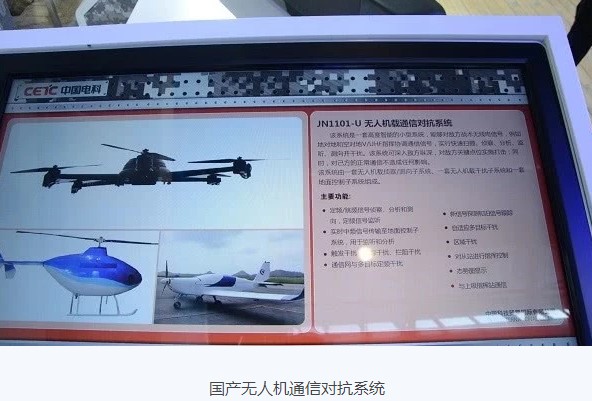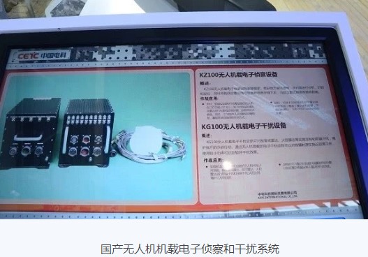 中国相关单位在珠海航展等国内外航展上面也展出过多种无人机电子战系统。例如2016年珠海航展公开展出的KZ-100无人机电子侦察系统,按照相关单位提供的资料,KZ-100电子侦察系统能够搜索、截获对方雷达系统信号,然后对信号进行分析,确定技术参数、性质和用途,确定信号源位置。这些信息可以通过数据链传递给后方指挥所,确定对方部署,从而推测对方动向,也可以用来积累电磁信号数据库,为我方电子战行动和电子战系统发展打下坚实的基础。还有一种系统是JN-1101-U无人机通信对抗系统,这个系统可以截获、定位对方无线电通信信号,进行分析、干扰和定位。系统可以自适应干扰目标,具备多种干扰手段。这两种系统还可以引导无人机上面光电探测系统和合成孔径雷达对目标进行精确识别,确定目标之后即可发射导弹进行攻击。