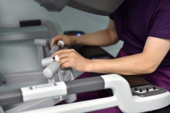 程向东坐在操控台前,通过控制杆来进行操作,应用机器人手臂,在布满细小血管、神经组织的腹腔内灵活翻转“穿针引线”,完成切除病灶,缝合处理吻合口等工作。