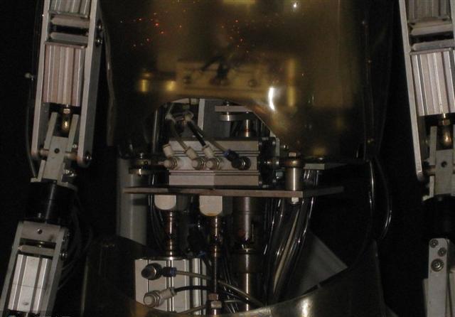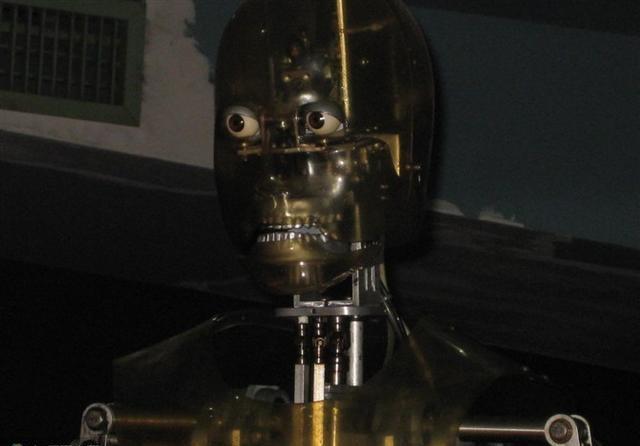 我们再来看到他的面部表情,真长得像电影疯狂的石头里面黄渤哥们角色,又长得像一个外星人怪物,近看真能把一个小朋友吓到,机器人头部结构由着各种大大小小的气缸设计组合而成,组装复杂,并且需要用气源来控制,根本无法做到自由灵活的动作。