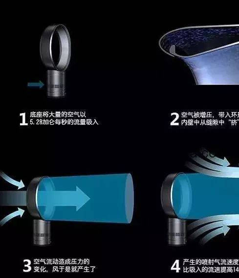 无叶风扇的工作原理为:基座中带有的40瓦电力马达每秒钟将33升的空气吸入风扇基座内部,经由气旋加速器加速后,空气流通速度最大被增大16倍左右,经由无叶风扇扇头环形内唇环绕,其环绕力带动扇头附近的空气随之进入扇头,并以每秒405升的速度向外吹出。