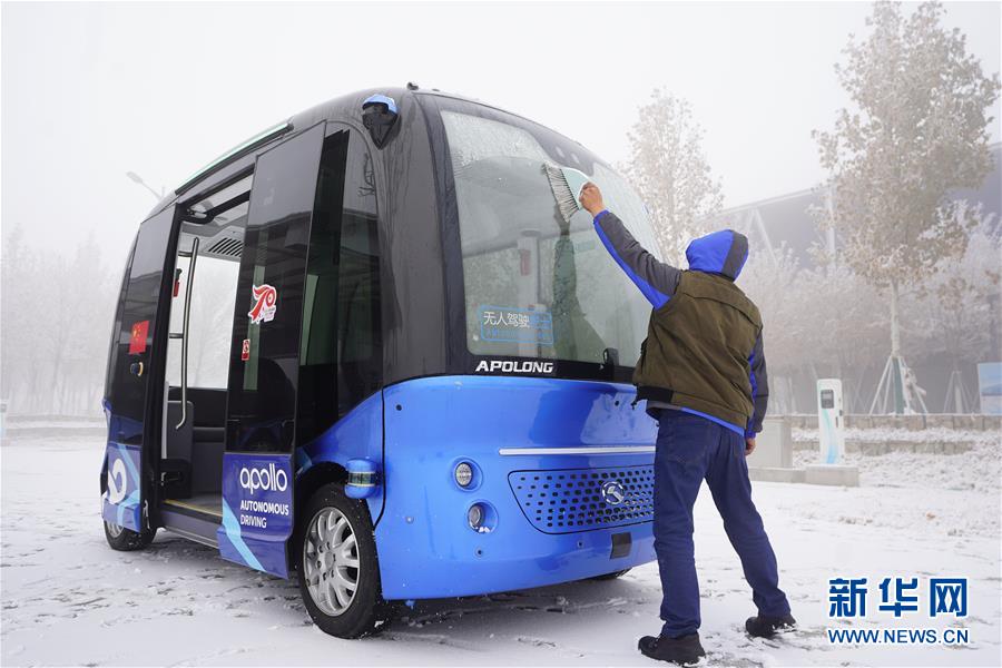 12月10日,工作人员在雄安新区清扫无人驾驶巴士的积雪。新华社记者 邢广利 摄