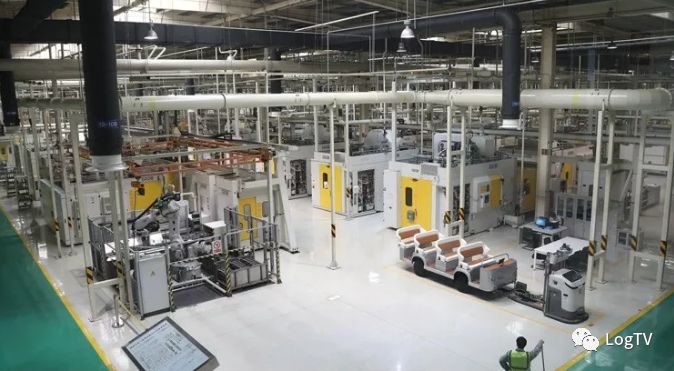 惠山工厂内的工人数量并不多,很多复杂的工序都是由工业机器人完成。车间内部,AGV小车载着曲轴等零部件来回穿梭,再结合空中连廊、自制件立体库、冷试SPS等系统,共同构建装配线全自动智能内部物流系统。