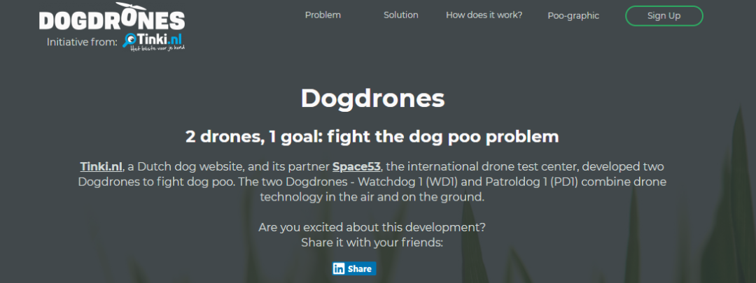 这些被称为Dogdrones的无人机以探测和清理粪便为目标,实行的是团体作战的策略。无人机上装有摄像头和热能技术,当粪便的GPS坐标传送给地面的滚动机器人后,滚动机器人就会立即前往清理粪便。Dogdrones是Gerben Lievers和Marc Sandelowsky提出的,二人在一个企业家活动上认识,从那以后就他们就联手开始了Dogdrones的研发。
