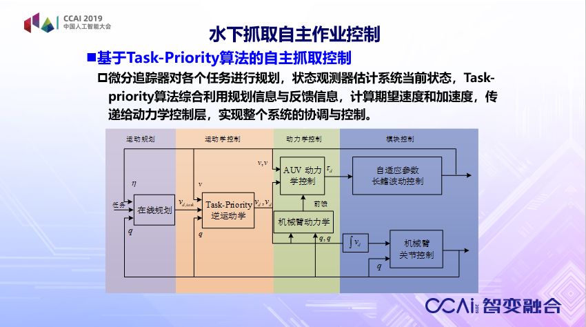 在给出视觉识别和运动控制之后,要考虑如何进行水下作业。我们用了一个多点杆的臂,这里可以看到一个比的简单运动控制效果。这是轻量臂做的一个抓取实验,阻力非常小,可以快速实现目标抓取作业。同时,我们从前面的运动规划到目标的抓取、跟踪识别,都统一在完整的系统里面,最后做一个完整的实验,基于任务优先级的,当离目标比较远的时候要想办法趋近目标,当离目标比较近的时候要判断是该抓取还是悬停,使机器人很好地完成最终的目的。