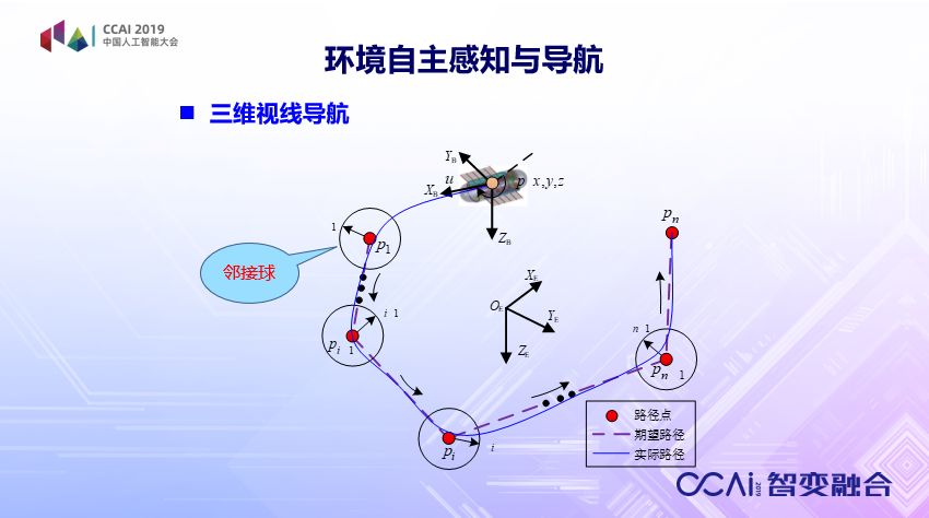 这个是出现定深的控制,保证机器人在一定深度进行工作,避免深度变化的影响。自己保证深度之后,可以跟水下底面保持一定的距离,保持自己的作业空间。下面介绍一些环境感知和导航的具体工作。当有了基本运动控制之后,希望机器人如何从它的初始点到达目标点,到达过程机器人要满足自身的约束条件,比如转弯不能太大,不同的速度下转弯半径是不一样的,而且浮浅时有下滑的角度,有的机器人是垂直下去,有的是必须有下滑角度才能实现运动控制。所以给出一个RDDH的运动控制的算法,简单来说就是把一个物理约束的东西,比如爬长城很累,那可以走Z字形,那机器人也可以用类似的方式实现类似的功能。这里面有了前面的基本运动控制工作,可以给出它的游速控制、航向控制,通过三维的视线导航,从前面的方法给出不同时刻机器人要到达的位置、速度和航向,可以对机器人实现三维空间的运动控制。这里给出一个三维的视线导航方法,三个连接球的方法,根据不同的切割点,机器人到达不同的路径之后实现对整个轨迹的跟踪。这里可以看到一个简单的三维路径点跟踪的实验,通过波动方式,在三维空间实现定点定向的不同路径点的跟踪过程。可以看到,本身的运动过程是三维空间进行运动的,并不是在一个平面运动。通过三维的跟踪方法,可以实现机器人从目标点到给定的工作区。