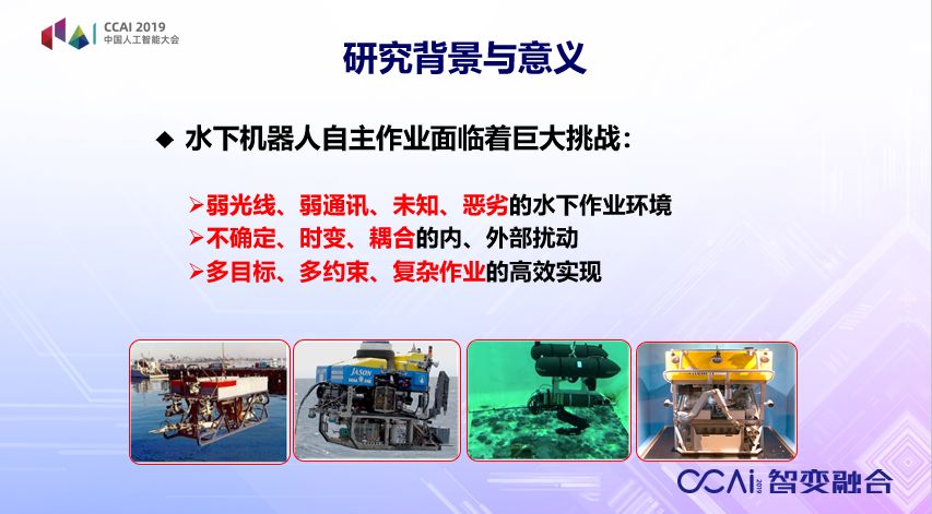 此外,我们在水下机器人进行运动时有很多不确定的扰动影响,水下洋流的变化、潮汐的变化,都有很大影响。另外有内外部的耦合,机器运动时产生的扰动在有些特殊环境下,对它本身也会造成响应的扰动影响。还有一些多目标、多约束的复杂作业的环境,我们让机器人完成有效的作业,完成不同的多个作业目标,要满足速度,不可能游的太快,不可能转弯太快,在有些避让的情况下要很好地路径规划。