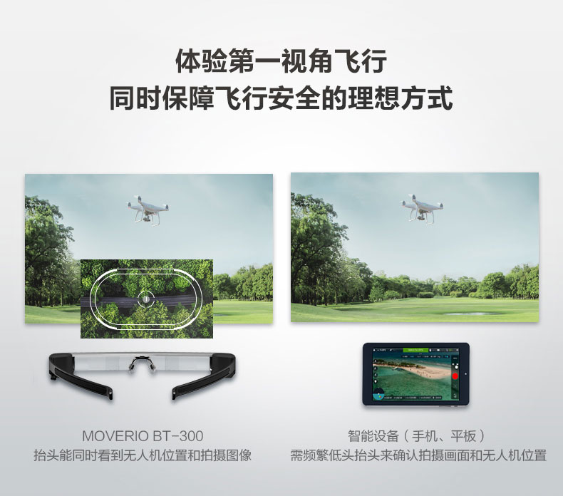 目前,该款无人机飞行眼镜允许用户使用大疆无人机的飞行控制器,适用于精灵 Phantom4 Advanced、精灵Phantom4 Normal、精灵Phantom4 Pro、晓Spark、悟Inspire1、悟Inspire2、御 MavicAir、御 Mavic Pro、御 Mavic Pro2及经纬 Matrice 100等多种机型。用户只需 在BT-300上安装相应无人机机型的APP并注册账号,通过USB数据线将BT-300与无人机遥控器连接,顺利配备后即可进行无人机飞行眼镜竞速操作。基于此合作的便利性,新人用户可借以遥控器充分磨炼无人机飞行技巧,让无人机头显竞速技能精益求精。