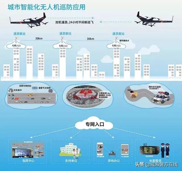不论是公安机关还是无人机企业,都在期盼一种“能够不再受到通讯距离的制约,足不出户控制无人机飞到任何一个角落”的全新无人机工作模式的出现。为实现在威海市山、海、林、陆并存的复杂地理环境下的无人机全域覆盖,真正把固定翼无人机打造成为现代化警务体系中的空中警务平台,针对当前无人机通信和作业模式的种种弊端,威海市公安局特巡警支队警务航空大队与零度智控科技有限公司紧密合作,按照“覆盖全域化、操控远程化、应用全警化、作业常态化”的思路,共同打造了“城市全域化无人机巡航工作模式”。