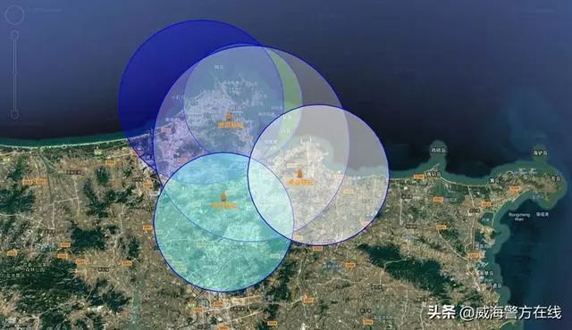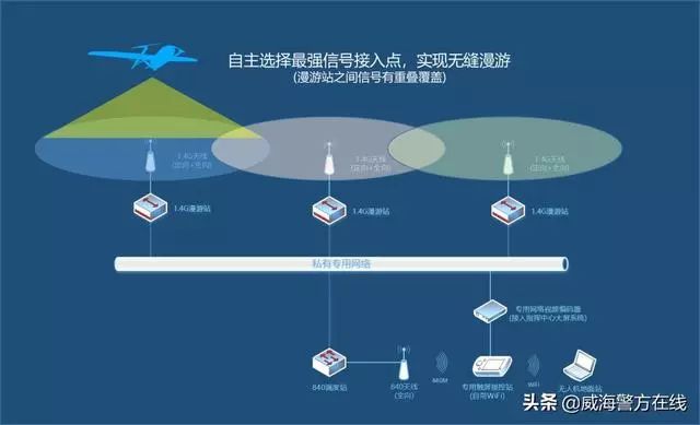 漫游基站部署示意图:通过在城市不同区域高点部署漫游基站,实现全域信号链接信号的多点中继、全域覆盖,使得无人机可轻松实现对整个威海市建成区的空中巡航,轻松应对各种突发事件,迅速从驻地起飞快速到达任务现场。