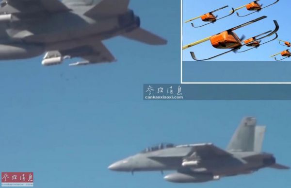 2016年10月,美海军3架F/A-18F战机组成编队同时释放103架“山鹑”微型无人机,小图为无人机特写