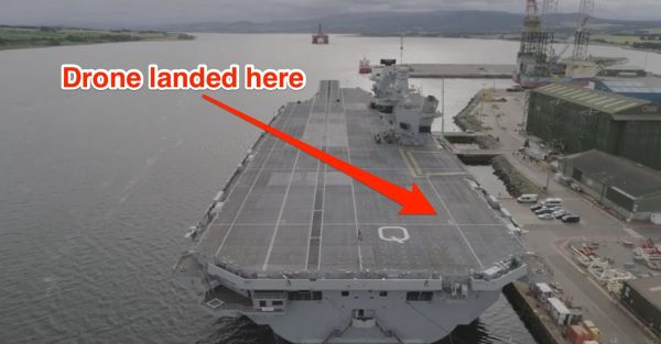 图中红箭头标出的就是“黑飞”四轴无人机降落到英军“女王”号航母飞行甲板的位置。(英国防部官网)