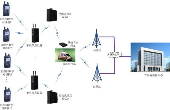 系统实现将前端自组网数字对讲机、单兵节点设备、便携式节点设备、基础节点设备等组成一个无线自组网络,保障青海省疾控中心卫生应急信息通信系统正常运行。