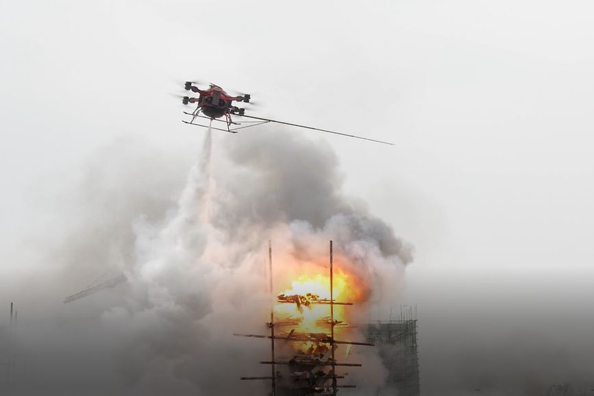为防止地震发生后,高层建筑的电气线路等设施因断路发生故障引发火灾,现场还模拟了高层建筑起火场景,使用中型多旋翼网联消防无人机,完成了接警起飞、寻找火点、数据传输、辅助决策、锁定火点、破窗扑灭等工作,第一时间控制了火情扩大,同时可进行及时有效的灭火工作、也解决了救援物资投送的难题。