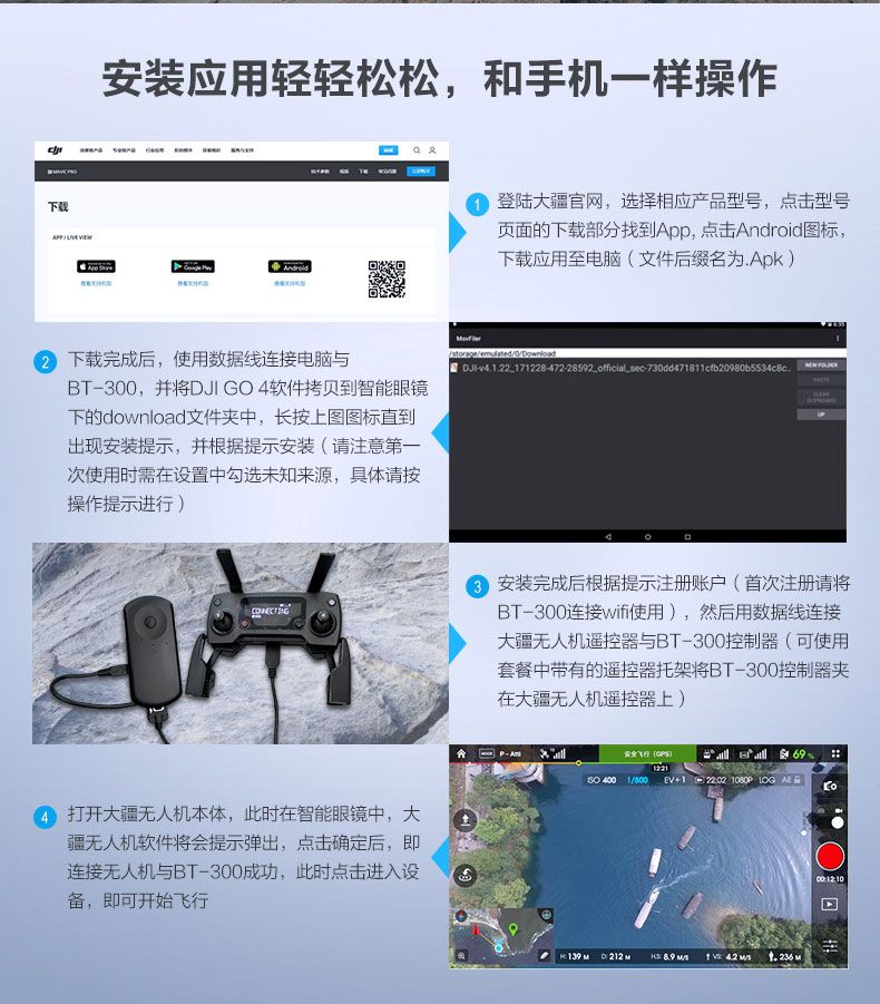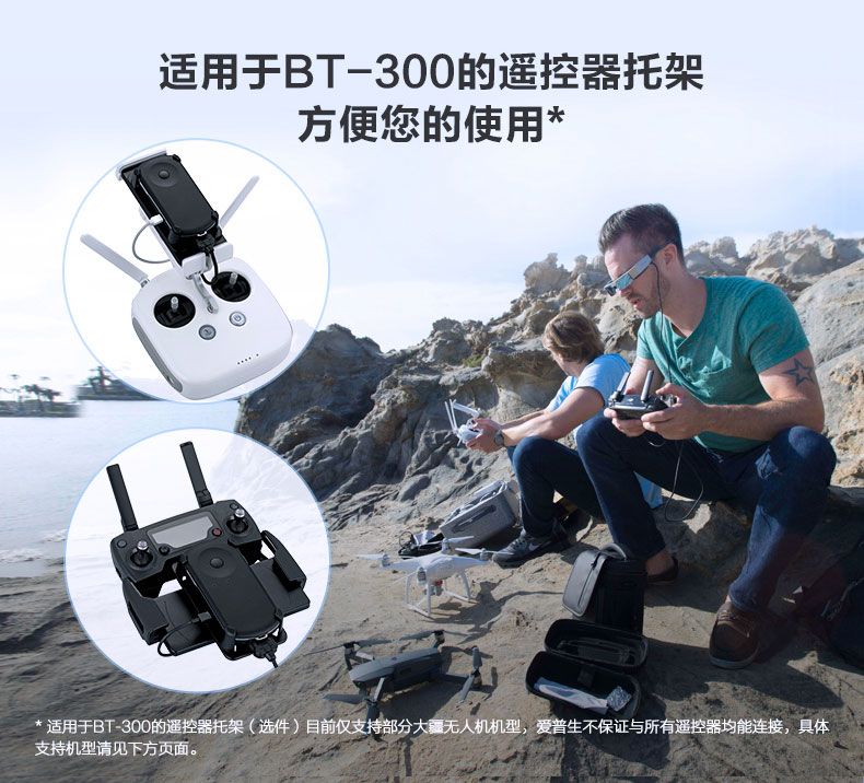 目前,该款无人机飞行眼镜允许用户使用大疆无人机的飞行控制器,适用于精灵 Phantom4 Advanced、精灵Phantom4 Normal、精灵Phantom4 Pro、晓Spark、悟Inspire1、悟Inspire2、御 Mavic Air、御 Mavic Pro、御 Mavic Pro2及经纬 Matrice 100等多种机型。用户只需 在BT-300上安装相应无人机机型的APP并注册账号,通过USB数据线将BT-300与无人机遥控器连接,顺利配备后即可进行无人机飞行眼镜竞速操作。基于此合作的便利性,新人用户可借以遥控器充分磨炼无人机飞行技巧,让无人机头显竞速技能精益求精。
