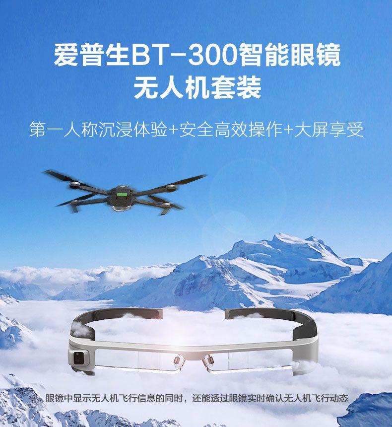 常常需要低头查看无人机遥控手机屏幕的你,为了能拍到更美的景色,10分钟,15分钟,20分钟,每一次起飞都是用“生命”在创作艺术。今天,小编就要给大家安利一款智能眼镜,它和VR设备一样可以给您带来炫酷的观影体验,还对无人机爱好者极其友好。爱普生BT-300智能飞行眼镜采用双目穿透式设计,其具备一块透明的镜片,所有重要的飞行数据,包括速度、方向和高度等和拍摄画面都显现在爱普生无人机飞行眼镜镜片上。得益于此,操控者无需频繁低头抬头,充分解放双手,这更让无人机头显竞速成为可能,并有效提升无人机飞行眼镜竞速操控时的安全性。
