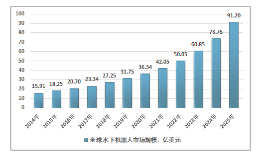 2014年全球水下机器人行业市场规模大约15.91亿美元,到2019年达到31.75亿美元,预测2025年有望达到91.20亿美元。