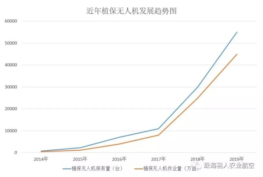 2016年被称为植保无人机行业发展的“元年”,而这四年植保无人机产业也得到了快速发展,具体表现在:1.重要的无人机厂家陆续介入,带来了产品性能、性价比的快速提升;2.设备销售量逐年上升,作业面积保持大幅度增长;3.国家提出政策支持,并且逐步纳入到政府补贴范围;4.各项作业标准、行业标准、质量标准、职业标准陆续推出,规范了行业发展。 截止到2019年10月份,植保无人机保有量5.5万余部,作业面积4.5亿余亩次。短短4年时间,植保无人机作业面积增长了近45倍。