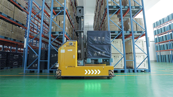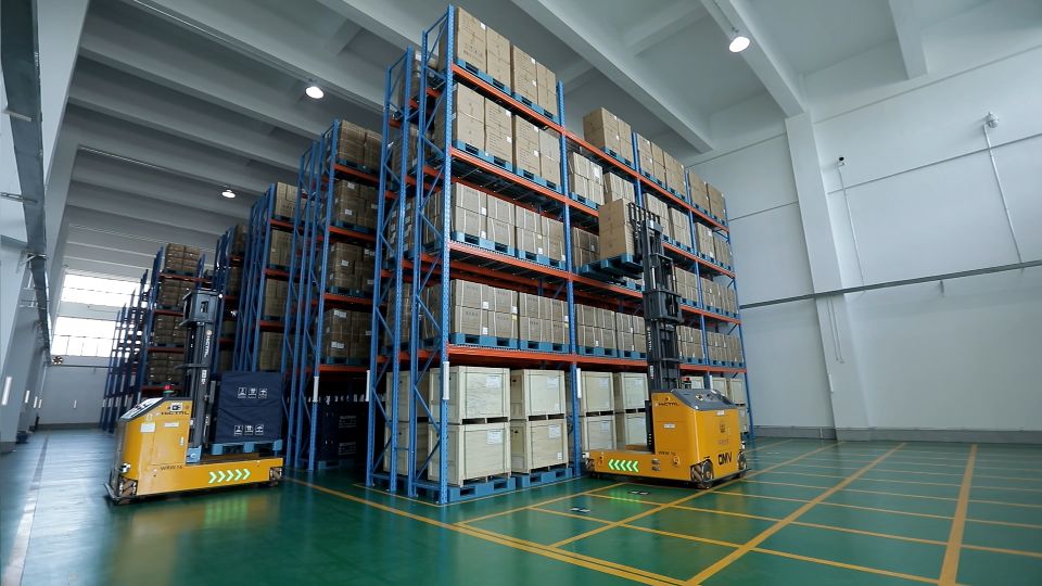 ①货架通道宽度2.3米,根据托盘尺寸及货架间隙定制OMV智能叉车车体的外形尺寸,充分利用货架与货架之间的仓储面积,提升储存货量;