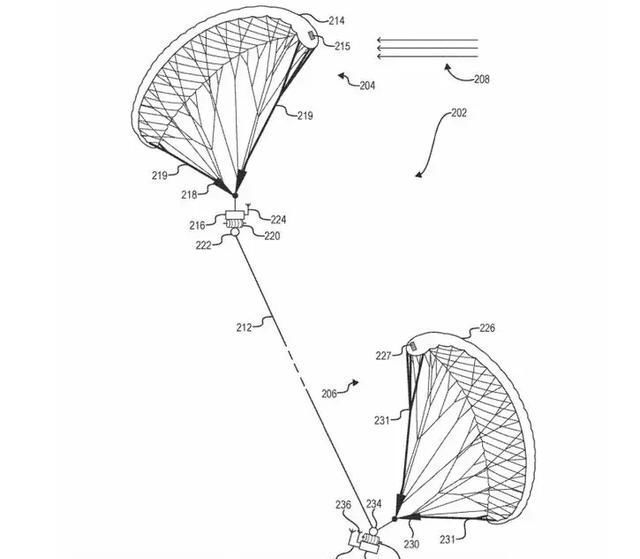 它被 Facebook 称为「双风筝飞行器」。根据 5 月 31 日公布的专利内容,这次无人机将会被连接到两只风筝上,两个风筝装置之间由一根一公里长的系绳连接,每只风筝都可以独立定向,并漂浮在不同的高度。