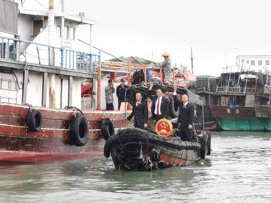 图:硇洲法庭法官乘船前往当事人的渔船开庭