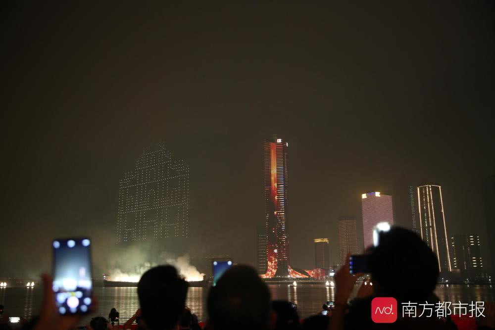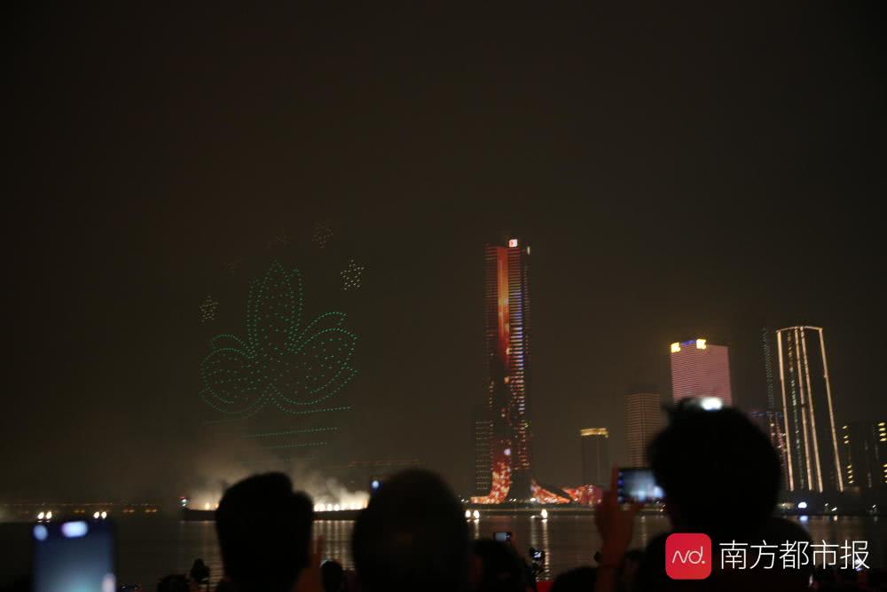 无人机表演,拼出澳门的地标“大三巴”和澳门特区区旗图案。