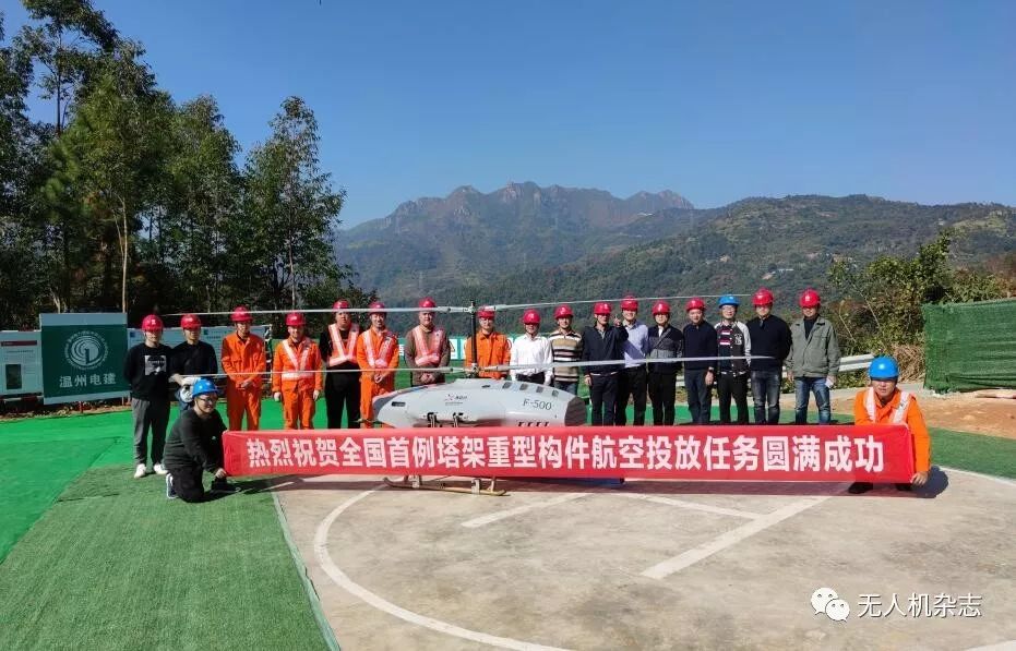 本次飞行任务验证了F-500重载共轴式无人直升机的任务载荷能力、抗风能力、可靠性、稳定性。F-500吊运投放系统可投放150千克重物,投放前后机体姿态无变化。F-500体积小、载荷大的优势在此次复杂地形山区作业得以充分展现,F-500只需一台厢式小货车即可运送到山腰起降点,并在狭小的空间完成起降。而其他布局的同量级无人直升机(单旋翼、纵列式)却难以实现。原本需要8名工人和3匹骡马,耗时25-30天的工作,使用F-500重载共轴式无人直升机吊运系统,一天内经4个架次就能将数百千克塔架钢结构飞行吊运并精准投放至施工地点,极大提高了工作效率,避免了修路及搬运引起的植被、树木破坏。