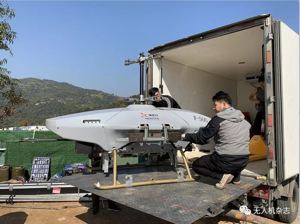 图2 F-500搭载近200千克重型钢结构件正在准备起飞