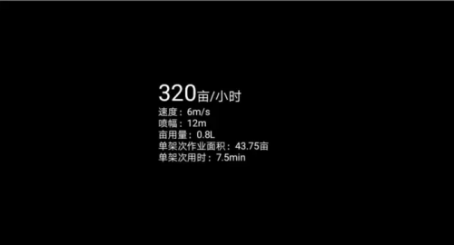 T35续航时间为1小时,满载飞行每小时油耗6L,每架次飞行时间大约为7分钟,该机喷幅为12米,飞行速度为6m/s,按国家对无人飞机的施药标准,去除起降及加药时间,每小时不低于320亩作业量。