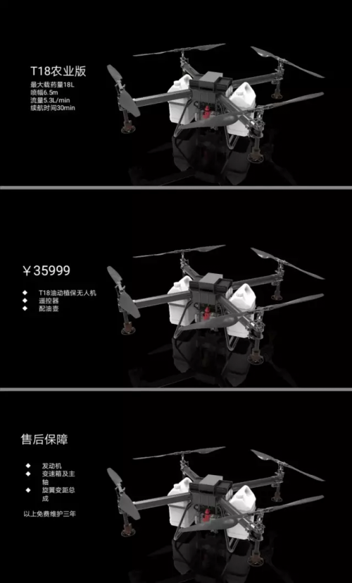 T18农业版主要部件亦质保三年,可见厂家对其技术水平深有信心。该机定价为35999元,最大载荷18公斤,各项植保功能一应俱全,电动多旋翼机手可轻松过渡。农业版可选配水冷发动机,以应对高温天气繁重作业。