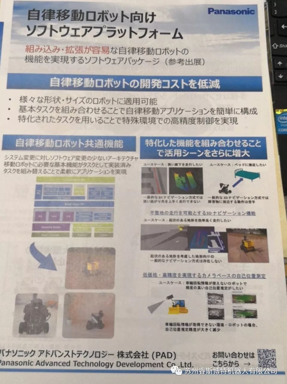 相比较国内比较热门的激光导航定位技术,日本也有厂商展示了自己的自主定位导航控制系统,比如日本松下。比较有趣的是,当时在展台负责介绍技术松下自主定位导航技术的博士也是位华人(国籍不详)