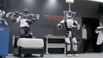 丰田展示了机器人T-HR3,人们可以通过操纵控制器,让机器人运动起来。