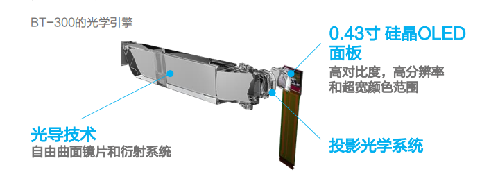 新型智能眼镜BT-300,采用硅晶OLED显示设备,显著提高画面的质感,通过独立的双目透视型显示设备,可以清晰再现3D图像,尽情体验沉浸式的临场体验!