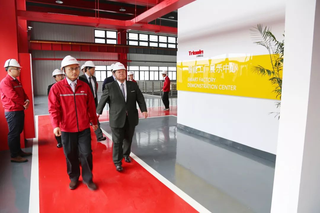 2019年4月24日,日本安川集团副总裁高宫浩一携中国总部相关领导一行到访沃迪,并在沃迪智能装备董事长赵吉斌的陪同下参观了智能制造车间。