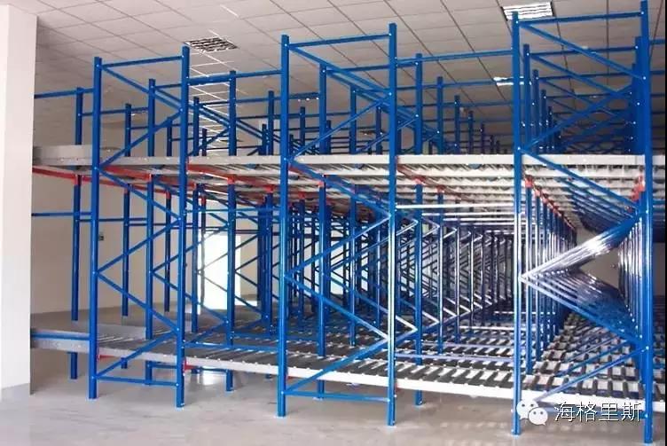 结构 | 1、流流利式货架的流利条直接连接到前后横梁及中间支撑梁上,横梁直接挂在支柱上。流利条安装倾斜度取决于货箱的尺寸、重量以及流利架的深度,通常取5%~9%。 2、流利条滚轮的承载力为6kg/只,当货物较重时,可以在一个滚道安装3-4根流利条。通常在深度方向上每隔0.6m安装一根支撑梁以增加流利条的刚度。当滚道较长时,可用分隔板将滚道隔开。取货端需安装制动片使货物减速,降低冲击。 | 重力式货架由托盘式货架演变而成,采用滚筒式轨道或底轮式托盘。重型货架又叫托盘式货架,具有承重大,高度适应范围广泛,机械存取,选取效率高等特点,但空间利用率一般。 |