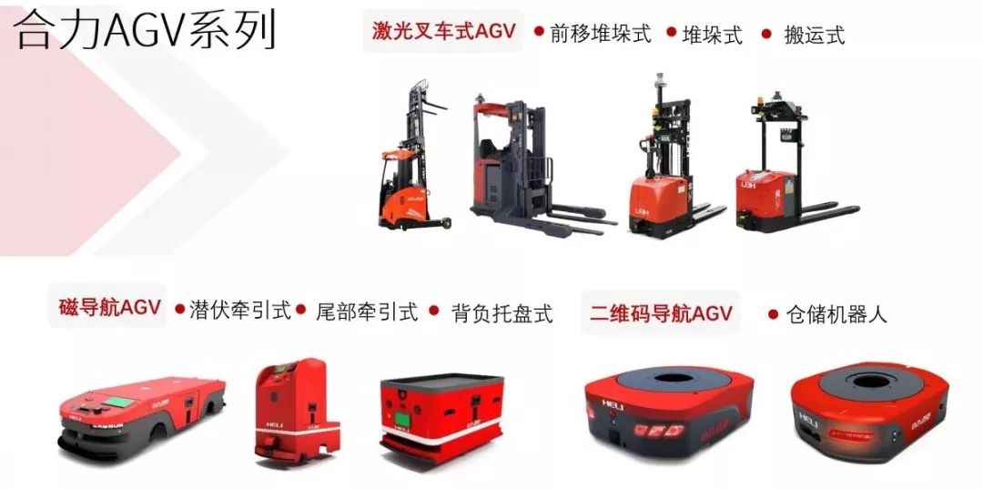 高举升式AGV,货架仓储用堆垛式AGV,生产线边搬用牵引、背负AGV,多点配送用仓储式AGV,仓库分拣用重载式AGV,大力出奇迹