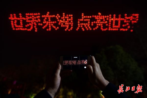 夜空中,无人机时而如繁星点点,时而如蜂巢出动,时而如阅兵列队,不断变换出7种不同的图案。天空作画布,当“大美东湖 灯耀江城”“世界东湖 点亮世界”“2020中国武汉”“花YOUNG武汉”等巨型字样出现时,现场观众纷纷拿出手机拍摄精彩瞬间,许多游客挥舞手中的荧光棒,仰天欢呼。“快看!200架无人机在天上‘跳舞’!”