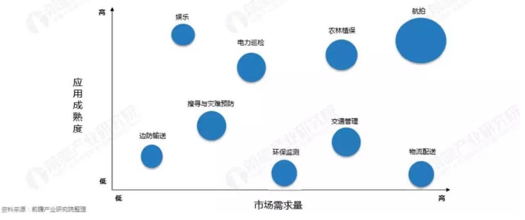 在全球民用无人机市场中,行业级市场的需求和规模一向都高于消费级。目前消费级市场,无人机的用途除了作为遥控玩具、无非是灯光表演、个人航拍和影视航拍。而在行业级市场中,无人机在农林、安防、电力、物流、地理勘探等各领域都有广泛用途。