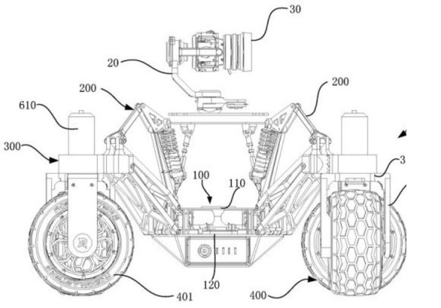 根据专利描述,这是一辆顶部装有摄像头的机动漫游车,相机车具有四个 360 度旋转车轮,大而坚固的车轮暗示其设计可以适应越野使用,车轮通过可以上下移动的杆与摄像头分离开来,摄像机放置在车顶部,其下方有一个阻尼器,支架上还有减震器以更好地消除抖动,摄像头也可以更换,此外,车辆的底盘可以根据行驶速度、道路情况而升高或者降低,从而适应各种行驶情况。