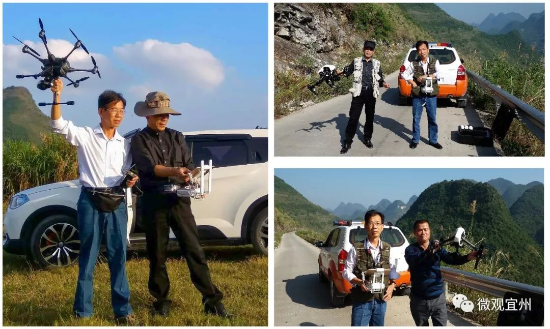 四通八达的乡村路网,无人机航拍,给我们带来了一个了解宜州乡村路网建设全新的大美视角:筑梦行。图为摄制人员在用无人机航拍乡村道路。