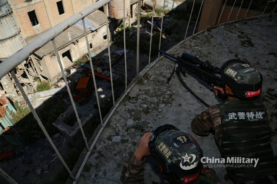 武警狙击小组在制高点布防,监控可疑目标。(图片来源:中国军网)