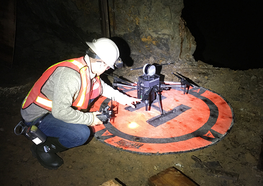 一名团队成员准备发射一台Exyn空中无人机,以帮助勘测一个旧金矿。