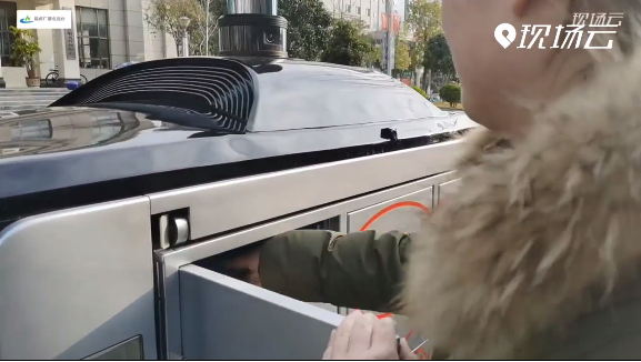 无人车已经行驶到了本次配送的终点:移动公司,京东物流平台会依据订单信息及网络指挥中心反馈地址等信息自动通知取件人到指定地点收货,以短信的形式下发验证码,收件人可通过输入验证码或人脸识别的方式通过验证后取件。我们现在看到取货人通过输入验证码完成了身份验证,货箱自动打开,当收件人取出快件关闭货箱后,本次配送任务完成。