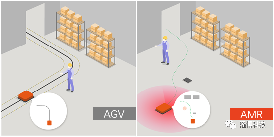 AGV拥有少量的传感器,仅仅能探测磁导引线路上的前方障碍物,但它无法绕过这些障碍物,因此它只是在障碍物被移走之前停在轨道上。而AMR拥有激光雷达、摄像头、超声波雷达等传感器,使其能够探测周围环境,并选择最优的路径到达目的地。